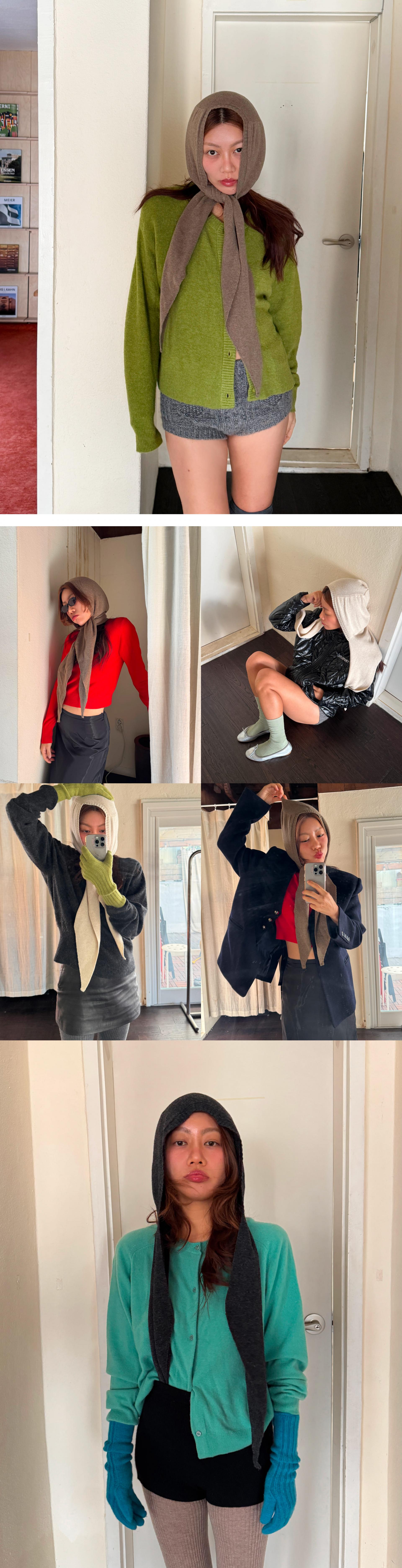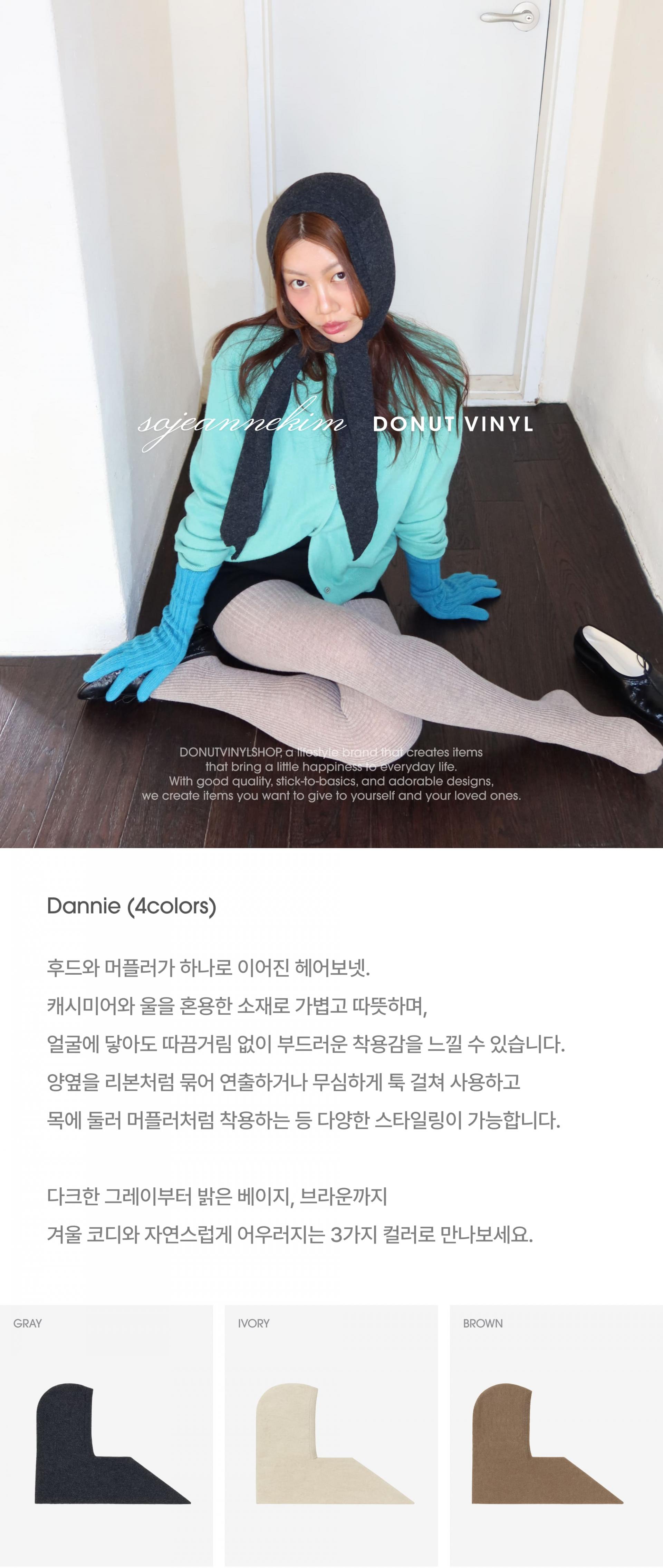 후드와 머플러가 하나로 이어진 헤어보넷.